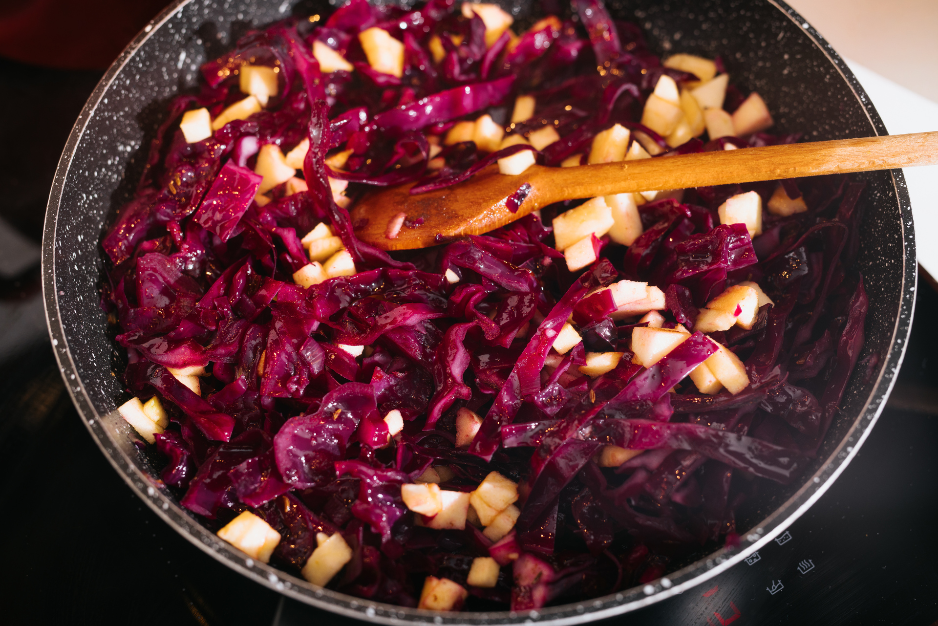 Kupus narežite na rezance, luk na kockice. Zagrijte masnoću u pa dodajte sjeckani luk. Kada luk omekša i poprimi zlatnu boju dodajte narezani kupus i promiješajte. Sortirajte dok kupus ne omekša, zalijte jabučnim octom. Pričekajte neka ocat ispari pa dodajte lovor list, promiješajte i poklopite. Kuhajte na srednje jakoj vatri. Jabuku ogulite i sitno nasjeckajte pa dodajte u kupus, pomiješajte. Začinite cimetom, muškatnim oraščićem i kimom. Ulijte malo vode ili temeljca dok kupus ne smekša uz povremeno miješanje. Pred kraj, posolite i malo popaprite.