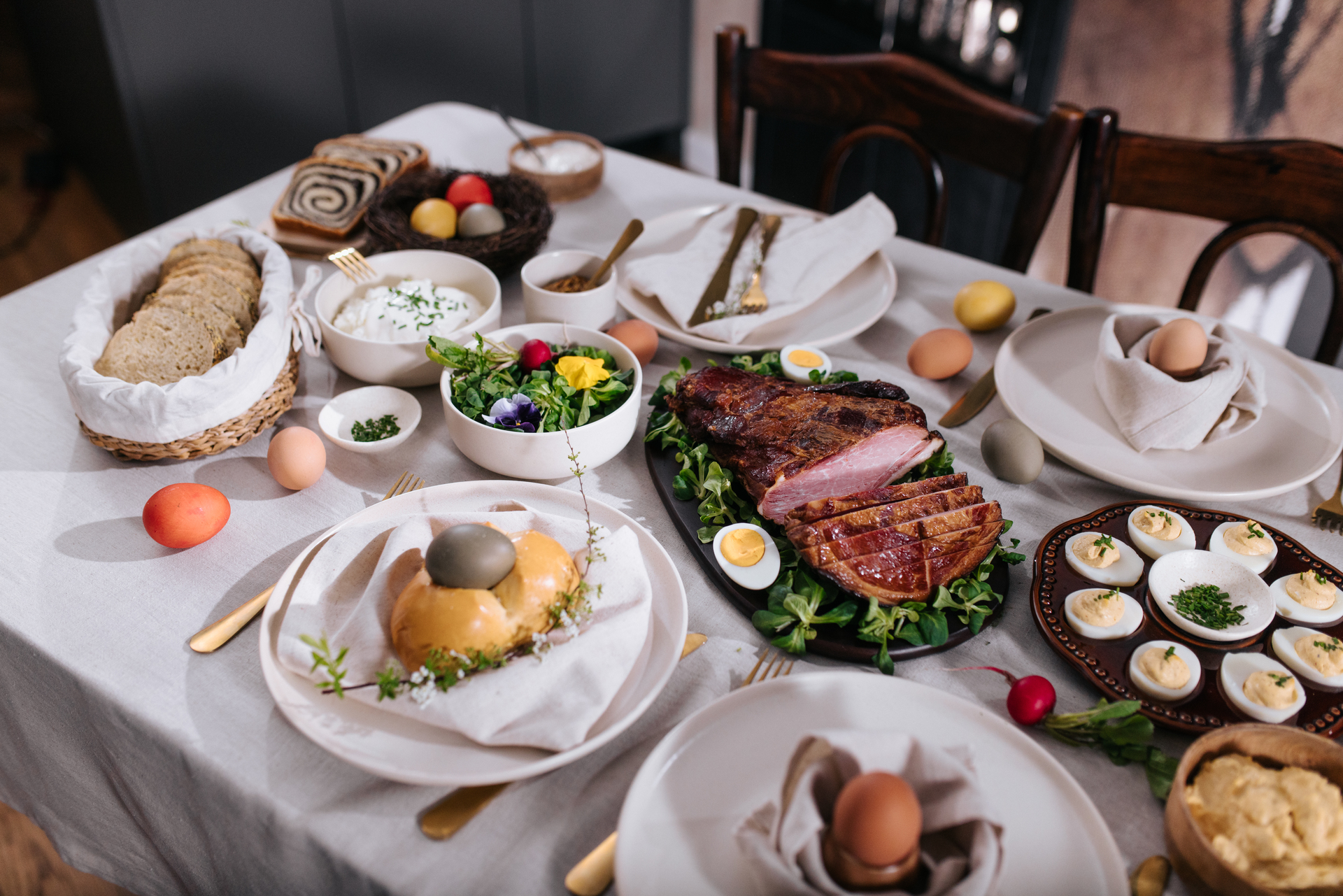 Uz šunku, uskrsni stol obogatite hrenom s vrhnjem, mladim salatama, svježim sirom s vrhnjem i vlascem, zrnatim senfom, punjenim jajima, mladim lukom i rotkvicama. Tako pripremljen stol bit će raskošan, svjež i u pravom blagdanskom duhu.